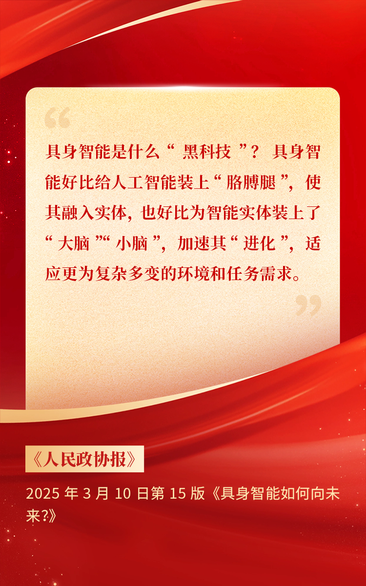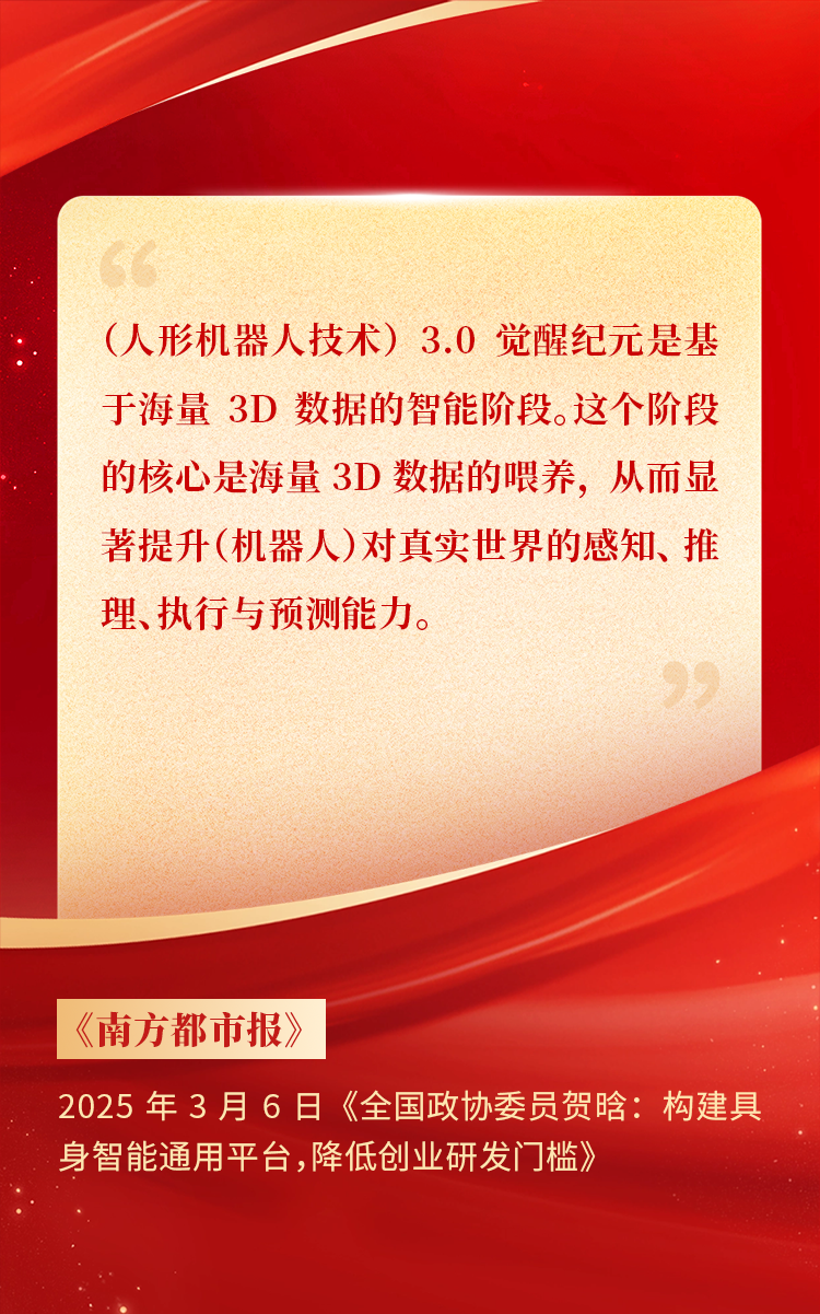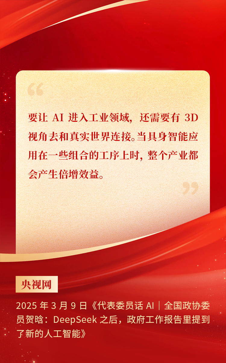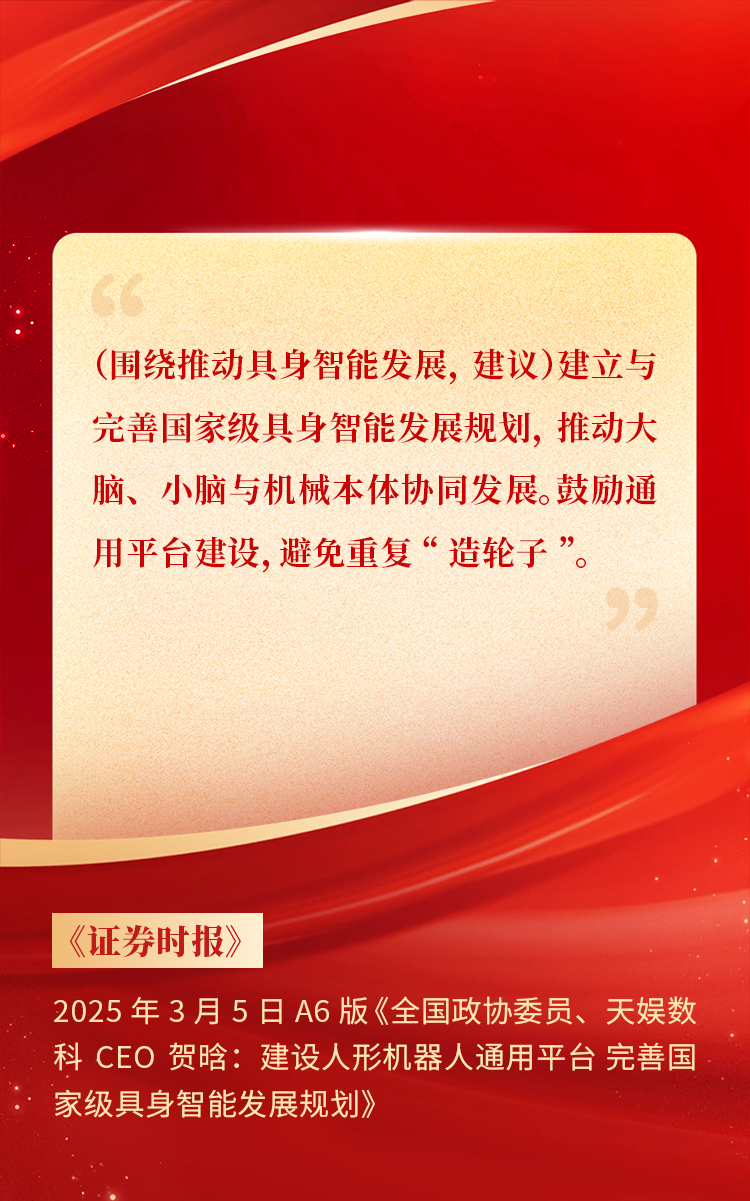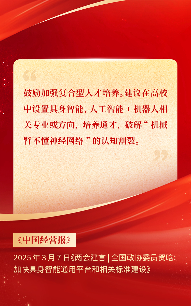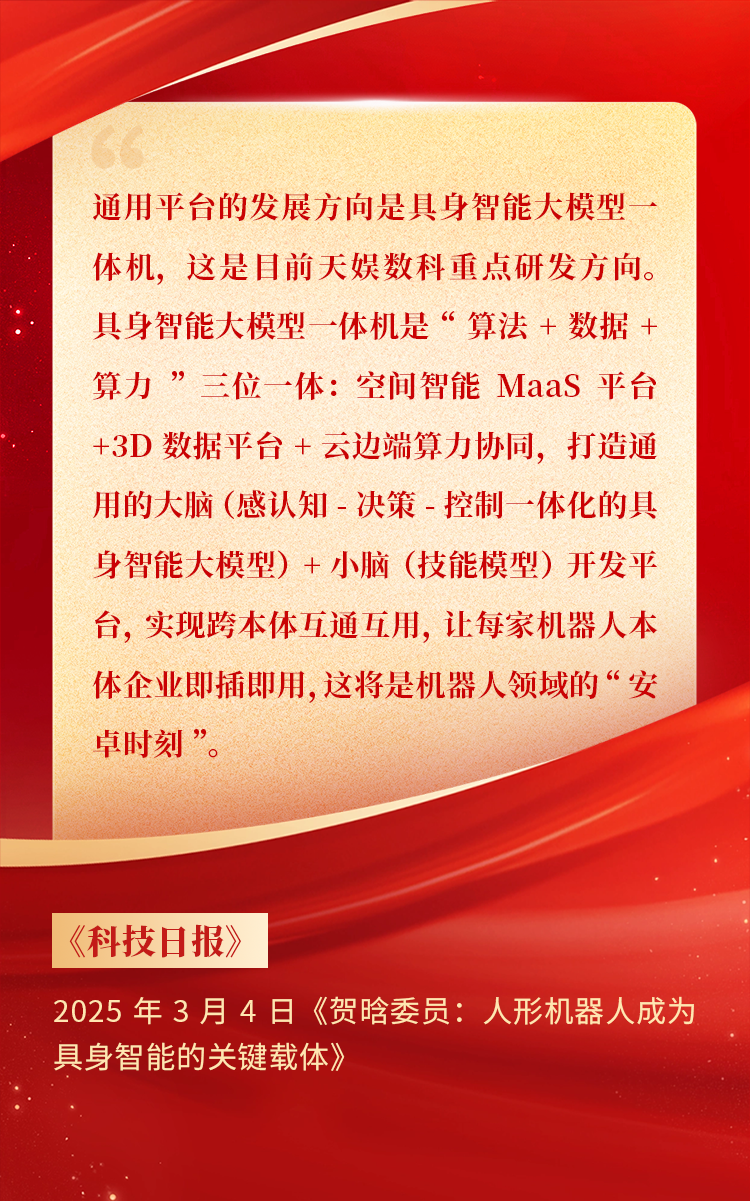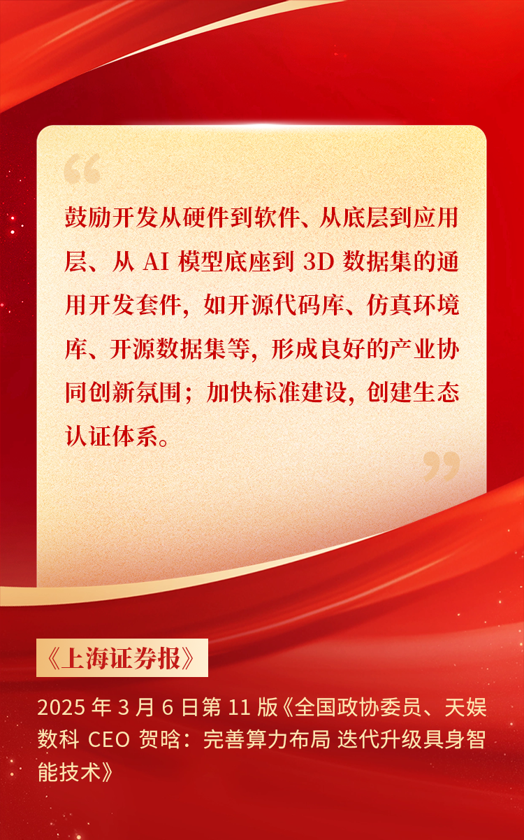 2025年3月10日下午,,,全国政协十四届三次会议于北京顺利闭幕。。。在今年的政府工作报告中,,,“科技”“技术”“创新”等词汇成了高频词,,,并且首次出现“具身智能”“6G”“智能机器人”等新词,,,强调“因地制宜发展新质生产力”。。。全国政协委员、、、胜天国际CEO贺晗连续第三年上会履职,,,围绕“具身智能”“人形机器人”“人工智能产业”等热词积极建言,,,受到了媒体的广泛关注,,,吸引了来自央视网、、、经济参考报、、、中国电子报、、、第一财经日报等央党媒体、、、主流财经等媒体记者的专访报道,,,让我们一起回顾贺晗委员两会建言!